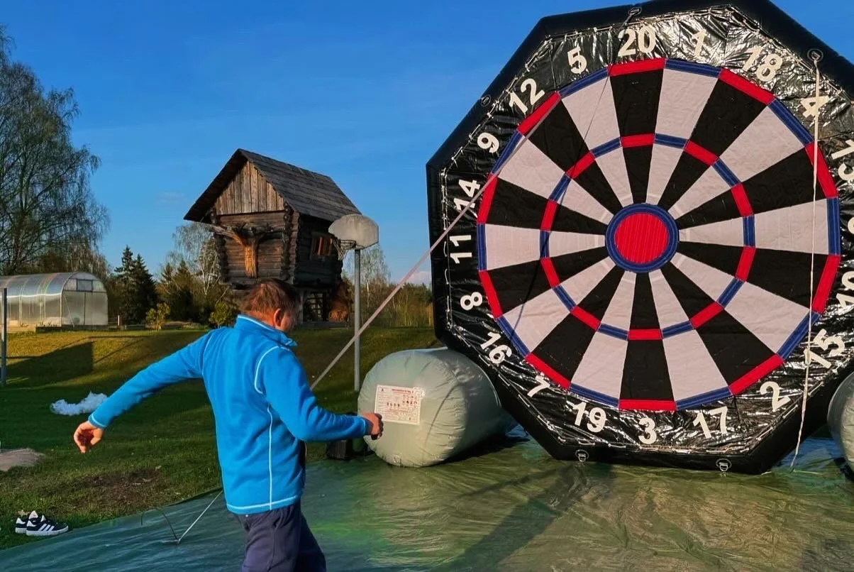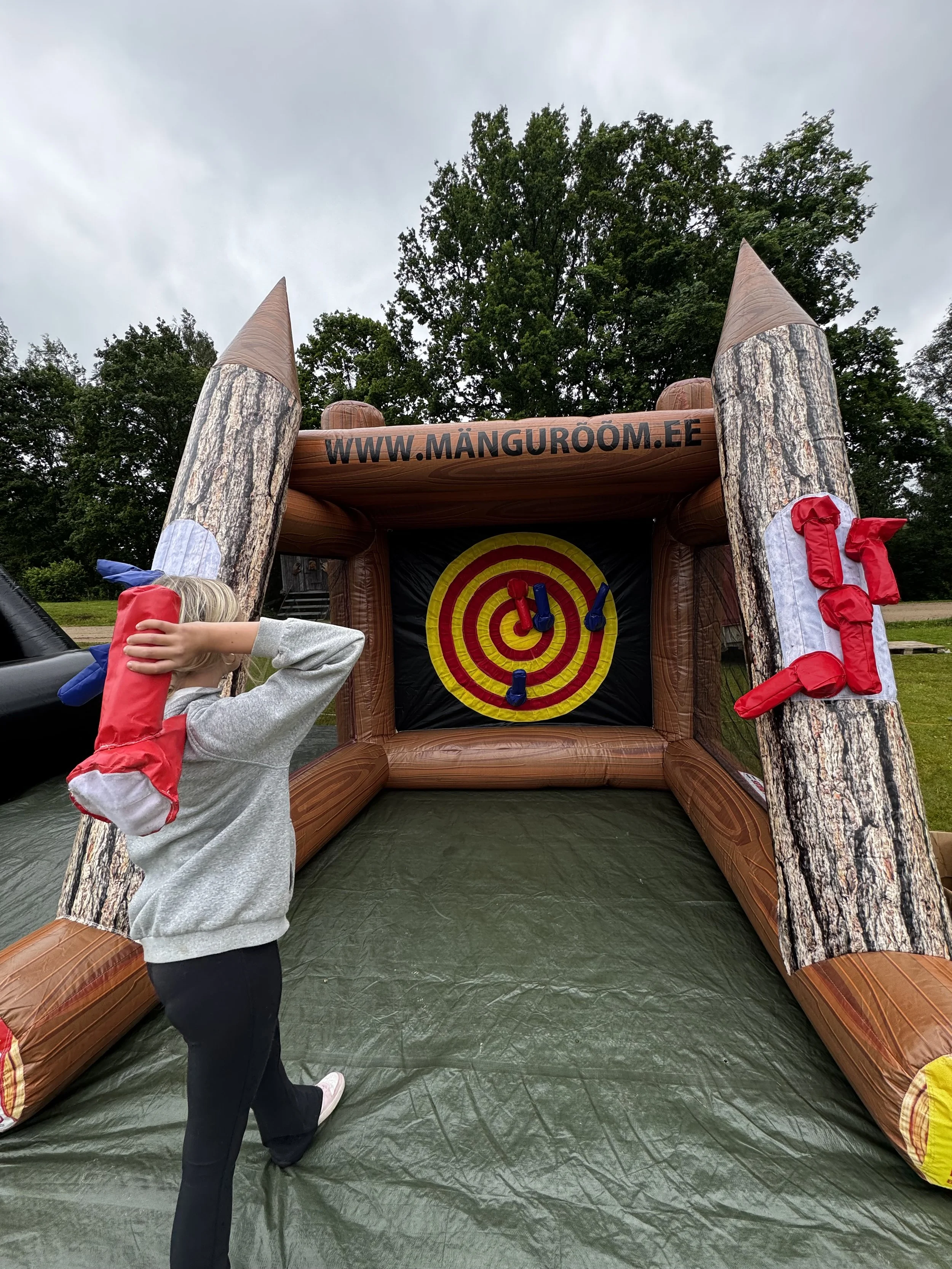 Täispuhutav noolemäng on ideaalne valik, suurus on 4,5x5 meetrit. Sobib ideaalselt jalgpalli või käsipalliga mängimiseks, kus pallid jäävad krõpsuga külge. Hind on 100 eurot.