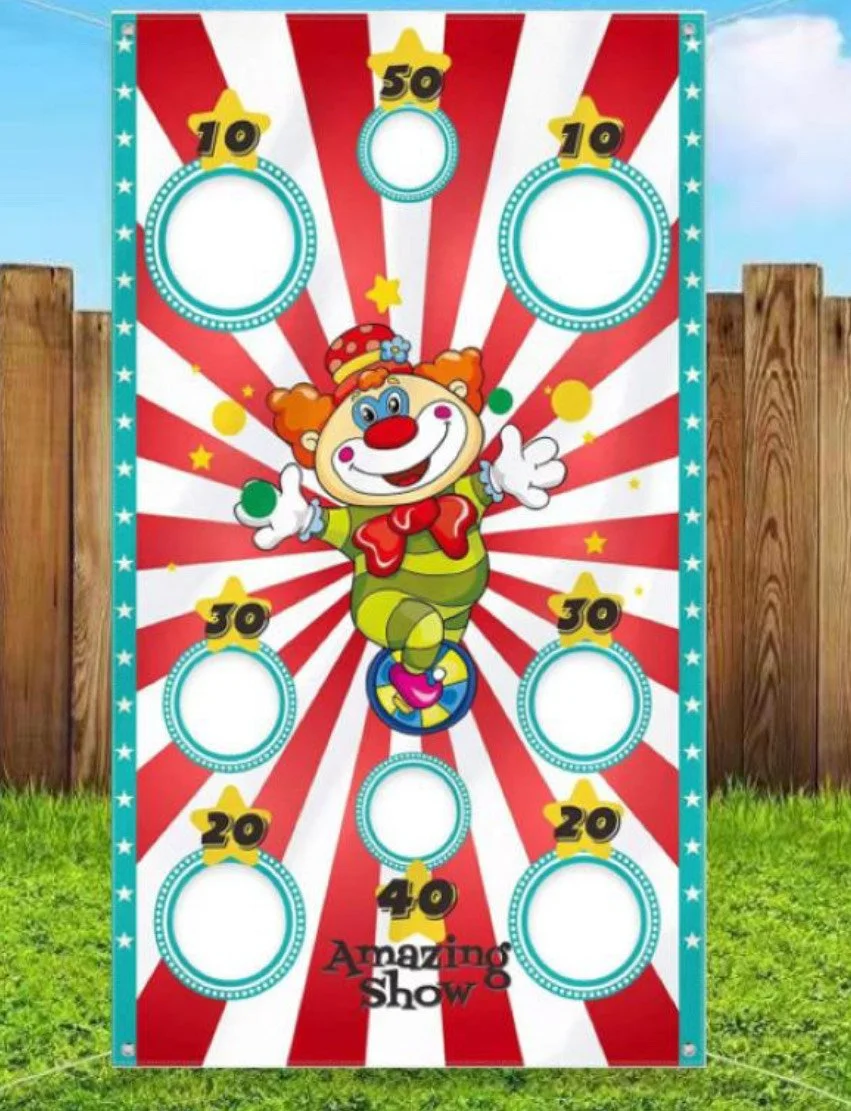 Klouni viskamise mäng, mille suurus on 70 cm x 135cm. Osalejad peavad viskama klouni mütsi auku. Hind: 45 eurot.